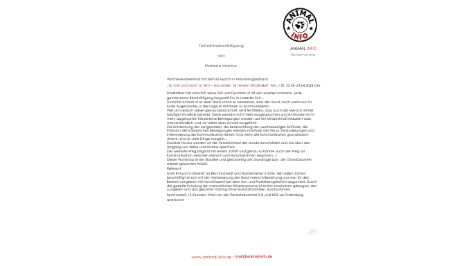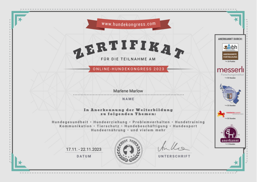 QualifikationHundetrainerin mit verhaltenstherapeutischer Ausrichtung;Sachkundenachweis gemäß § 11 Abs. 1 Nr. 8 (f) TierSchGAusgebildete Hynosetherapeutin und Coach für den MenschenTellington TTouch®Reiki I